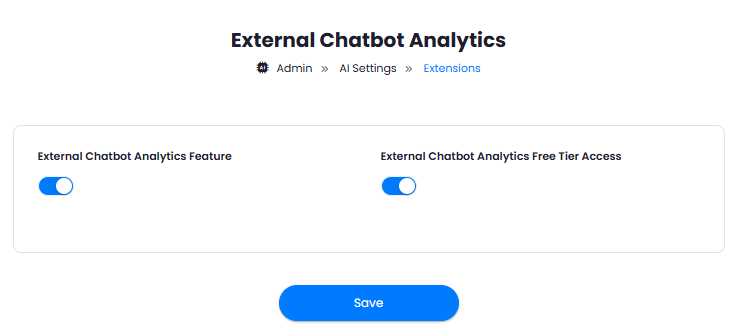 To control the settings of External Chatbot Analytics exension, return to AI Settings page in Admin Panel and click on the Extensions tab, and select External Chatbot Analytics extension.