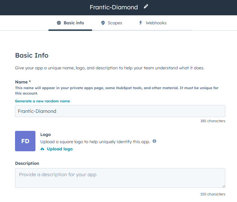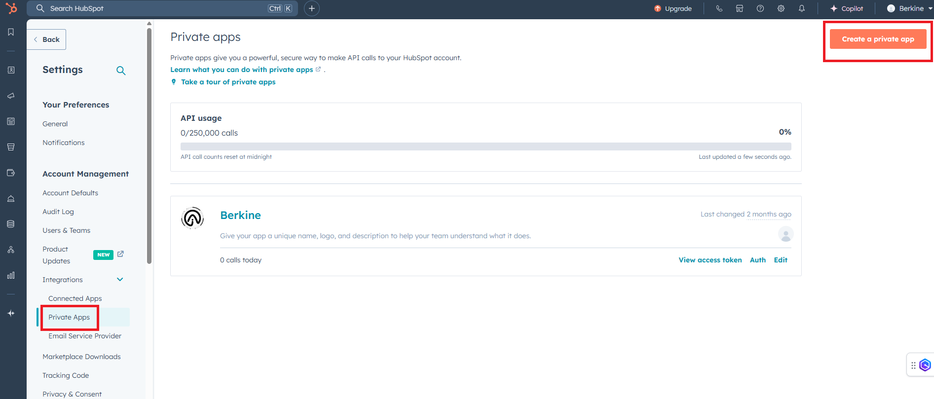 - On the left menu panel, go to Integrations - Private Apps page and click on Create a private app button.