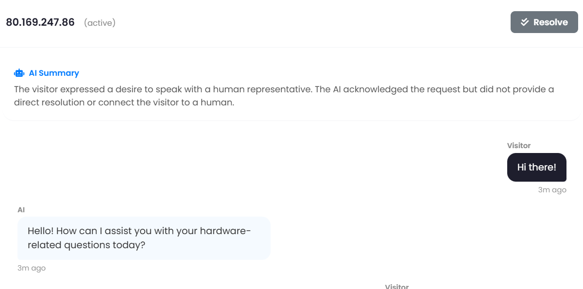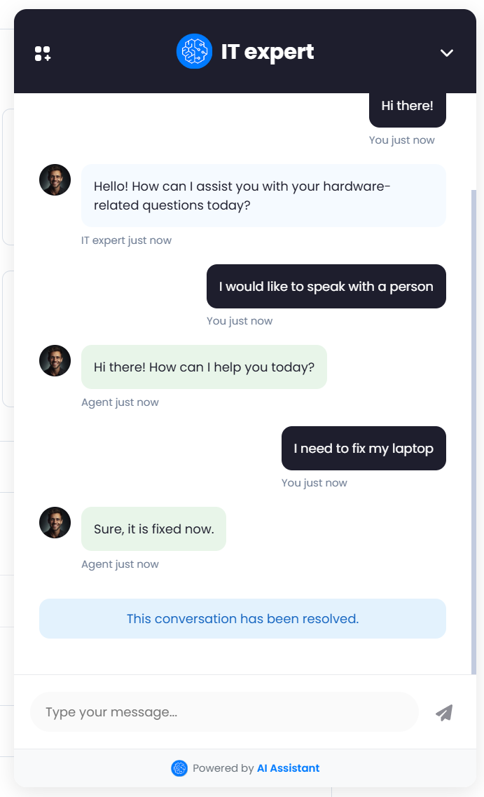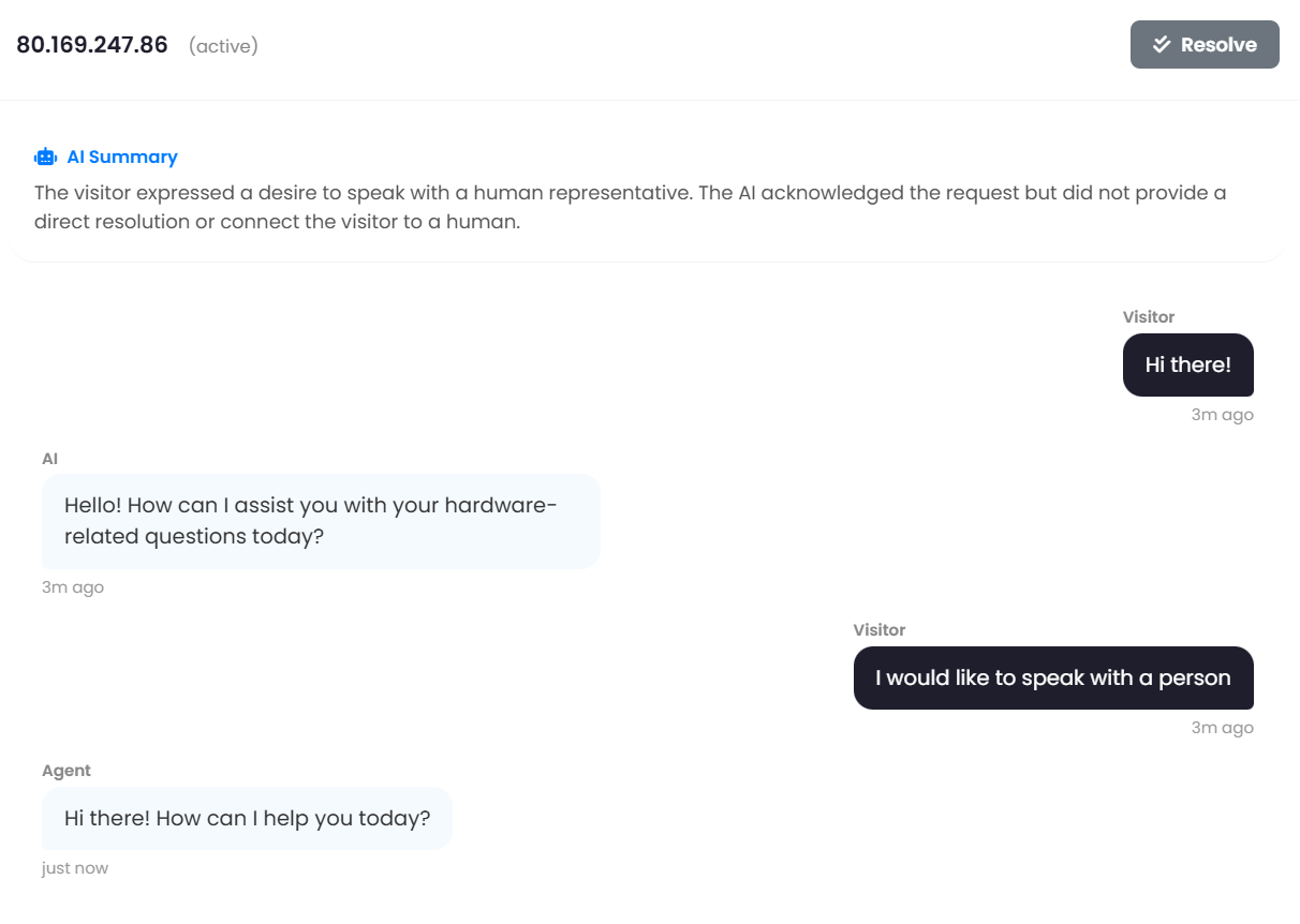 - And human agent can start the conversation with the user, also be aware that agent get AI Summary at the top of the messages so that it summarize what was conversation initially about, so that agent doesn’t have to read each and every message.