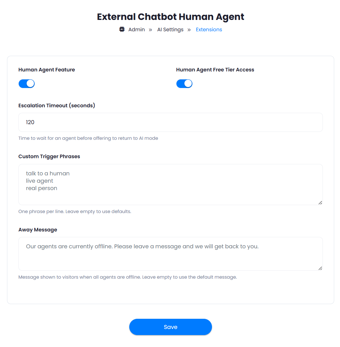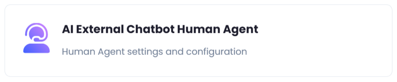 After installation is completed, go to AI Settings page in Admin Panel and click on Extensions tab there. Click on Human Agent for External Chatbot there.
