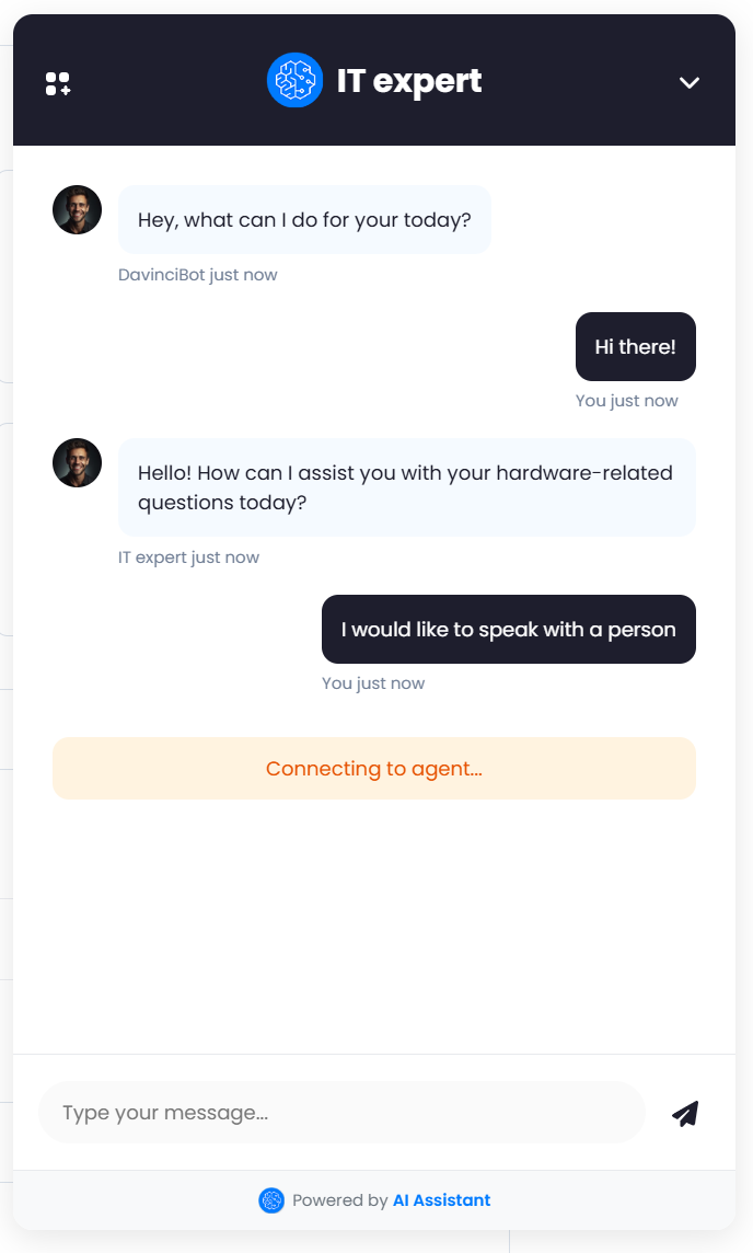 - During the converation in the chatbot, user can ask to “speak with a person” like in the example shown below, and he will see a message: Connecting to agent…