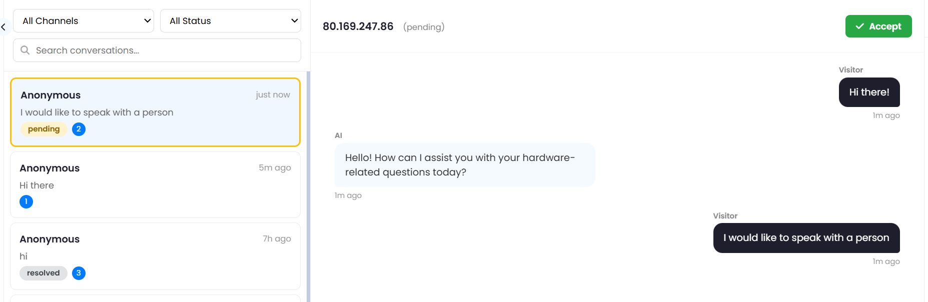 - Yellow: (Pending conversations that human agent didn’t accept yet)