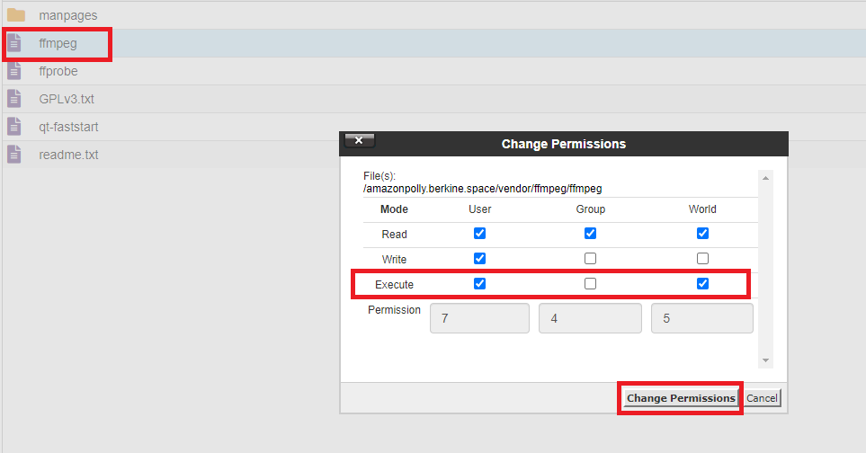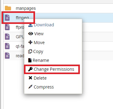 - Change file permission of ffmpeg to be executable by anyone as shown in below