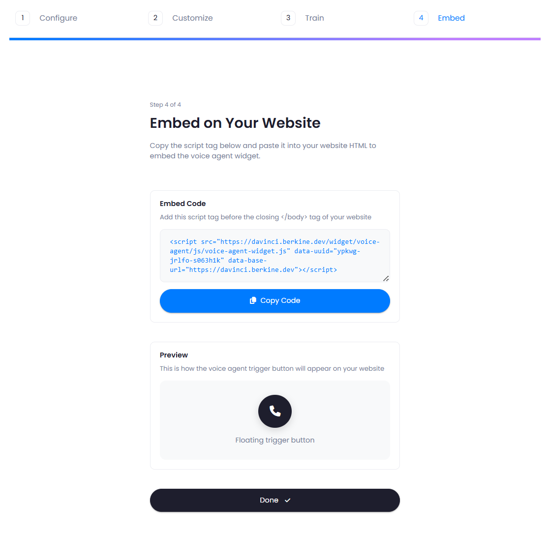 After you are done with creating and training your chatbot, to embed the chatbot into your website, you can use the provided code snippet.