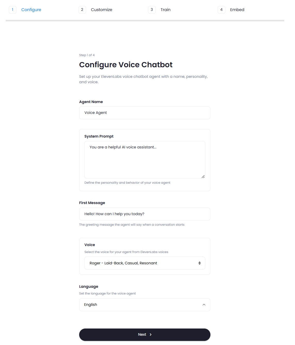 To create your chatbot click on the Create New Voice Chatbot button.Step 1. Configure Chatbot