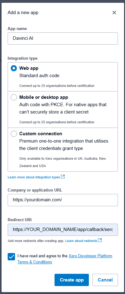 - Next, enter your App Name and select Web App for the Integration type, and provide your Company URL. For Redirect URL enter following https://YOUR_DOMAIN_NAME/app/callback/xero and click on Create App button once done.