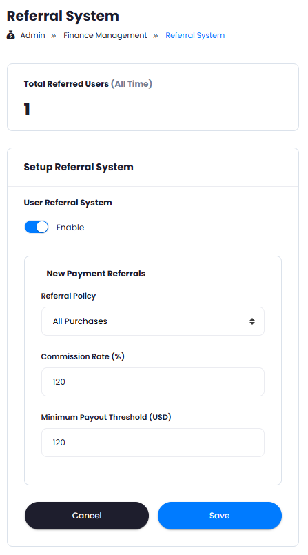 - To let your users be able to refer their friends, turn on the User Referral System checkbox
