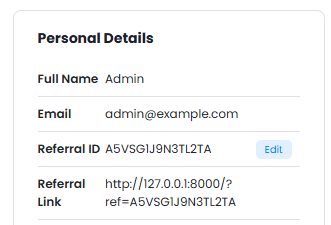 Davinci AI also allows your users to change their Referral IDs to a custom ones, and then share it accordingly with their friends. To change Referral ID, go to My Accounts page in User Panel, and under Personal Details section, click on theEditbutton next to your Referral Id, change as needed.